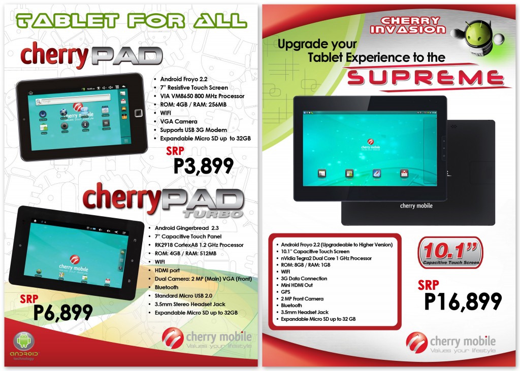What made me really drool were the tablets — the Cherry Pad, Cherry Pad Turbo and Supreme. The first two are considered entry-level tablets, with the Cherry Pad running on an 800 MHz processor on an Android 2.2 Froyo platform while the Turbo is equipped with a 1.2GHz processor running Android’s Gingerbread. Both gadgets have a 7″ Full Touch Sceen, WiFi connectivity, 4GB internal storage and can read a microSD of up 32GB capacity. I love the fact that these tablets are sold below the P10,000 mark, way below actually. You might be disappointed with the camera though. The lower version only has a VGA camera, while the higher priced tablet has two — 2MP at the back and VGA in front. These gadgets are still worth considering especially if you already have a camera with higher resolution.