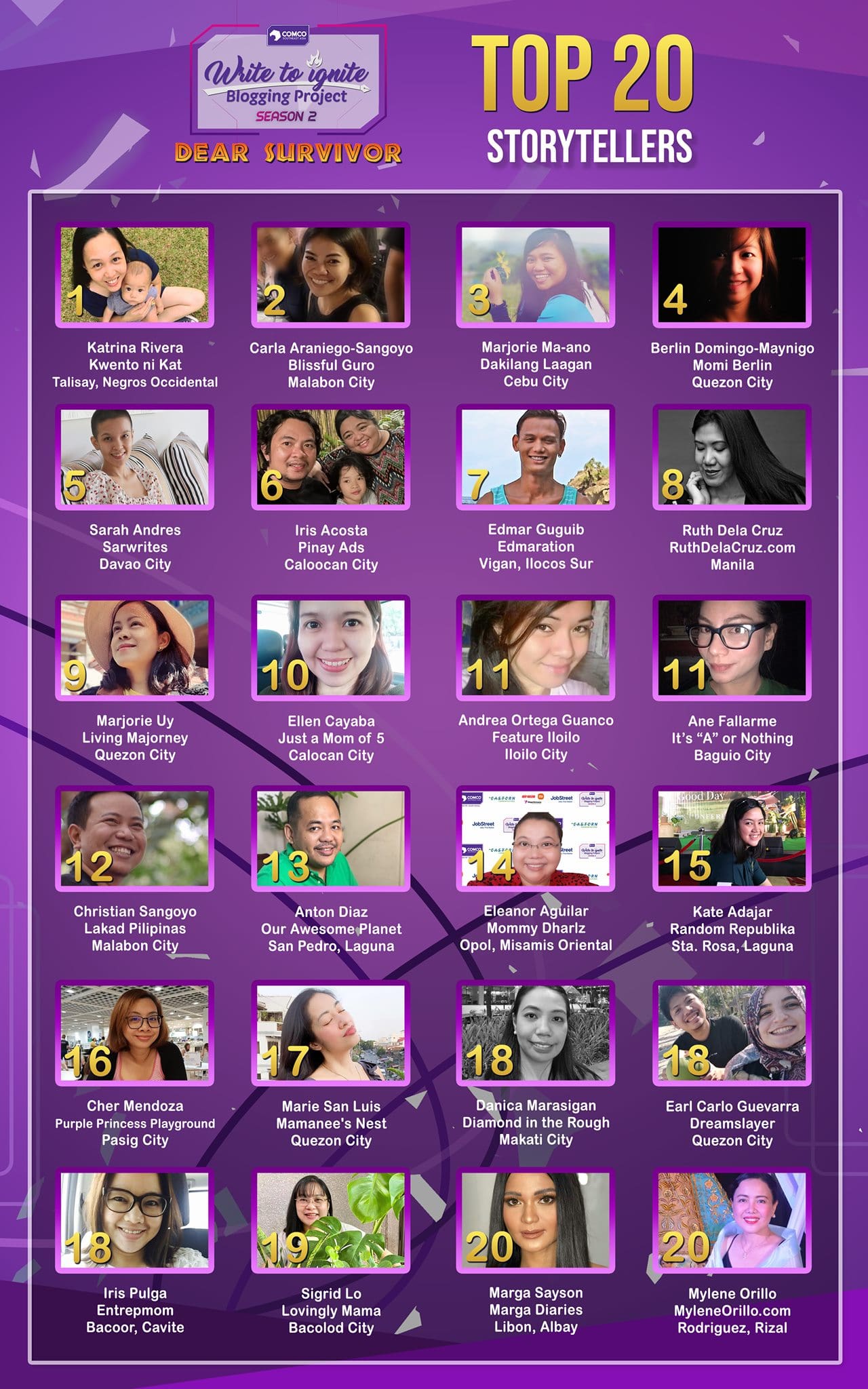 Storytellers from Talisay City in Negros Occidental, Malabon City, Cebu City, Quezon City, and Davao City emerged as the top winners for ComCo Southeast Asia’s “Write to Ignite Blogging Project” Season 2.